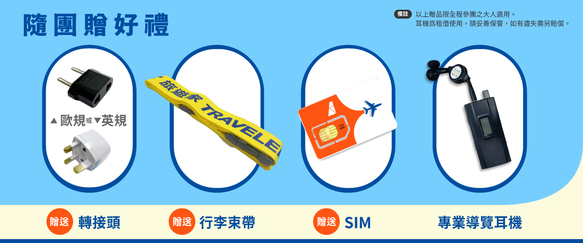 旅遊品質再升級,本行程全程提供個人專業導覽耳機,讓您隨心自在趴趴走,專業導覽解說不漏聽。