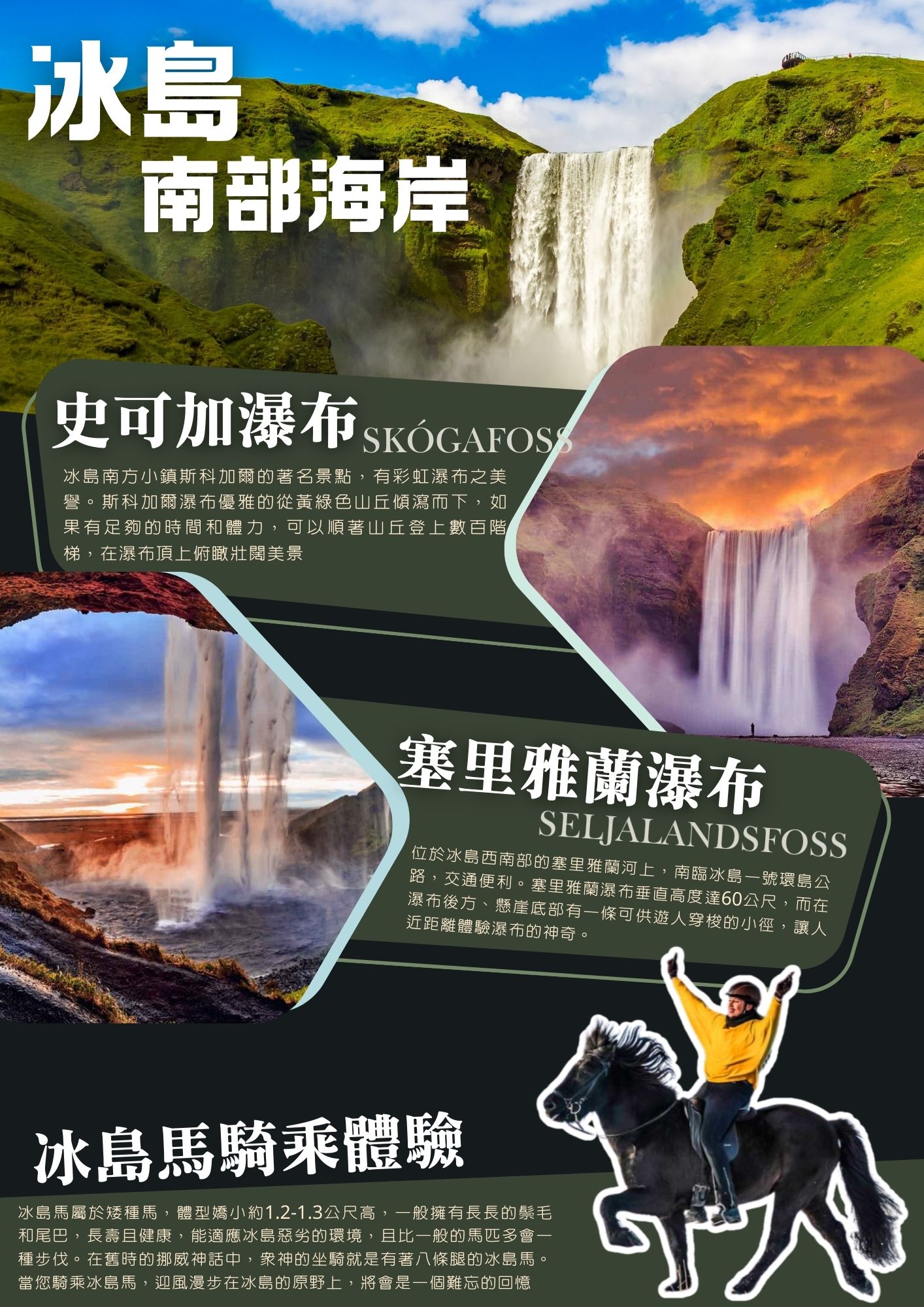 早餐後我們來個南部海岸線之旅。途中將經過氣勢磅礡的◎史可加瀑布(Skógafoss)冰島南方小鎮斯科加爾的著名景點,有彩虹瀑布之美譽。斯科加爾瀑布優雅的從黃綠色山丘傾瀉而下,如果有足夠的時間和體力,可以順著山丘登上數百階梯,在瀑布頂上俯瞰壯闊美景。◎塞里雅蘭瀑布(Seljalandsfoss),位於冰島西南部的塞里雅蘭河上,南臨冰島一號環島公路,交通便利。塞里雅蘭瀑布垂直高度達60公尺,而在瀑布後方、懸崖底部有一條可供遊人穿梭的小徑,讓人近距離體驗瀑布的神奇。接著獨家安排★冰島馬騎乘體驗(Horse back riding),冰島馬屬於矮種馬,體型嬌小約1.2-1.3公尺高,一般擁有長長的鬃毛和尾巴,長壽且健康,能適應冰島惡劣的環境,且比一般的馬匹多會一種步伐。在舊時的挪威神話中,眾神的坐騎就是有著八條腿的冰島馬。當您騎乘冰島馬,迎風漫步在冰島的原野上,將會是一個難忘的回憶!