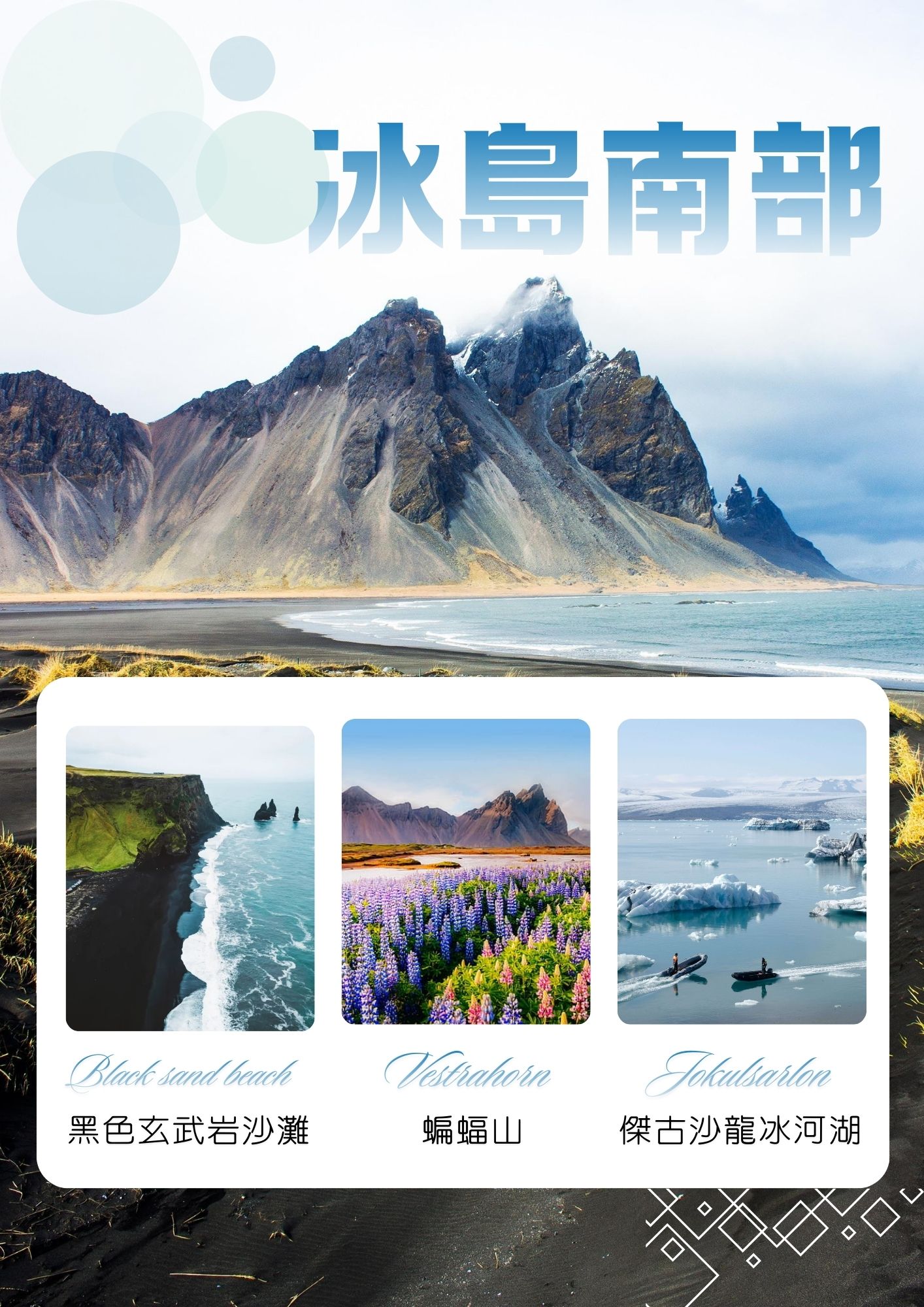 早餐後首先前往欣賞被美國《Inlands Mazagine》列為世界十大海灘之一的美麗海岸線。我們來到一片神秘的◎黑色玄武岩沙灘(BLACK SAND BEACH),黑色玄武岩是火山熔岩的傑作,在海風海浪的歲月裡雕琢,將玄武岩磨成黑沙形成冰黑沙灘奇景。在維克小鎮附近的黑沙灘,黑得透徹、沙石柔細、不黏腳也不沾色,海水依然清澈透亮。接著前往◎傑古沙龍冰河湖(JOKULSARLON),搭乘★水陸兩用船,零距離親近萬年古冰。傑古沙龍冰河湖位於冰島最大的瓦特那冰原前緣,二十世紀初時,原本並沒有這座冰河湖,然而隨著工業的發展,溫室效應導致全球暖化,瓦特那冰原也日漸融化,前端部分便形成了冰河湖。可以說,傑古沙龍就是全球暖化的例證。靜立湖畔,遠處斑斑雪白的山峰和岸邊黑色的沙岩形成強烈的對比,湖中四散漂浮的冰雪在日光的折射下,散發出冰藍的光芒。近年來溫室效應加強,冰河融化的速度也隨之變快,或許在未來的某一天,瓦特納冰原也將消逝無蹤。◎蝙蝠山Vestrahorn又稱冰島天空之境,是冰島東南部霍爾納菲厄澤附近的一座壯麗的山峰,以其尖銳的山脊和獨特的地質特徵而聞名,Vestrahorn的山體由古老的火山岩構成,山峰高達454米,直接從大西洋中拔地而起,形成了一個戲劇性的海岸線。山腳下是黑沙灘和潟湖,常常可以看到海浪拍打著岸邊,增添了自然的野性之美。這裡的景色隨著天氣和光線的變化而不斷變化,尤其是在日出和日落時分,山峰和海灘被染上金色和粉紅色的光輝,呈現出令人嘆為觀止的景象。除了自然景觀,Vestrahorn地區還擁有豐富的野生動植物,遊客可能會看到海鳥在此棲息,甚至有機會遇見野生的冰島馬。無論是專業攝影師還是普通遊客,這裡都是一個不可錯過的目的地,提供了一個欣賞和體驗冰島自然之美的好去處。