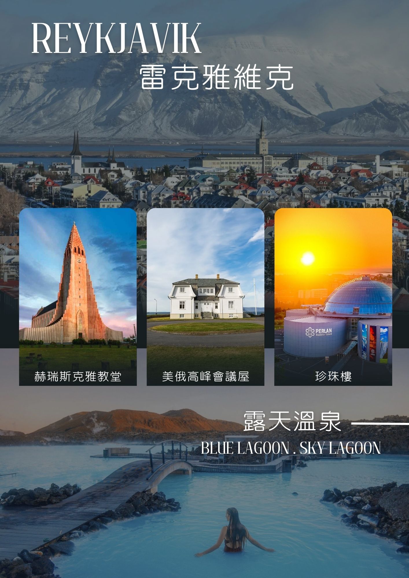 今日搭機前往飛往冰島首府─雷克雅維克。抵達這魔幻的國度後展開市區觀光,帶您走訪城市中重要的景點。冰島第一大天主教堂◎赫瑞斯克雅教堂(Hallgrimskirkja),是雷克亞維克著名的地標之一,其約有75公尺高並位於山丘上,在20公里遠處即可看見此建築。 它的建造時間長達34年(1940~1974年),被用以紀念冰島有名的詩人Reverend Hallgrímur Pétursson。由正面看教堂,建築外面兩側設計有多根直柱,此為象徵冰島火山造成的玄武岩柱;教堂內部陳設儉樸,最有特色的是一座擁有5,275根管子、像武器般的巨大管風琴;遊客還可付費搭乘電梯至教堂頂端的高塔,這裡有瀏覽全市景觀的最佳視野。前往1986美國總統雷根與前蘇聯共產黨總書記戈巴契夫舉行的◎美俄高峰會議屋(Höfði House)。接著前往狀似水晶球的◎珍珠樓(Perlan),其實是自來水公司的展示中心,空中腑瞰就如一顆玻璃珍珠鑲在六個圓形花瓣中-就是巨大的儲水筒,儲放從地面下擷取的滾燙熱泉。