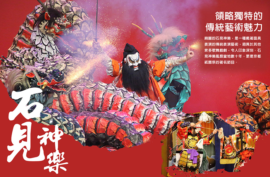 【石見神樂】急迫、躁動、絢麗又激烈的石見神樂,是一種戴著面具表演的傳統表演藝術,迥異於其他眾多歌舞戲劇,令人印象深刻。石見神樂風靡當地數十年,更是京都祇園祭的著名節目。神樂舞講述的故事大多取材於西元八世紀的古代歷史書籍,以及能劇中的知名神鬼傳說戲碼。故事中的角色一般善惡分明,有英雄必然就有反派、有神靈必然就有鬼怪、有好人必然就有惡徒,故事情節相當明顯易懂。故事中還經常出現持劍決鬥的場面,雖然經過事先編排,但依然讓人血脈噴張。《八岐大蛇》是石見神樂表演中最壯觀、最獨特的戲碼,也是整場表演的壓軸經典。講述的是從前有一條大蛇為害世間。巨蛇體長 15 公尺,有著八對血紅的大眼和八張噴出火焰的蛇口,而一位英雄挺身而出與祂搏鬥、成功將其殺死,並贏得了公主的芳心。表演時,搏鬥場面隨著劇情發展,會變得愈發激烈。而最後,八岐大蛇被斬成碎片的一幕尤為精彩。石見神樂是一種民間藝術。但是石見神樂不同於其他日本藝術或其他地方的神樂,並沒有將自身僵化在傳統的神樂形式中。石見神樂不忘自身根源,卻也不斷推陳出新。