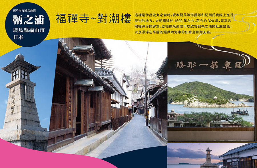 【福禪寺對潮樓】真言宗寺院福禪寺由空也上人於平安時代950年左右所建。本堂鄰旁的客殿為江戶時代建造,有330年歷史的「對潮樓」則被列為國家史跡。位於山丘上的對潮樓在江戶時代曾是朝鮮通信使的迎賓館,從對潮樓的和室遠眺平靜的瀨戶內海和海上群島等鞆之浦絕景。其中一名朝鮮通信使在此觀景盛讚為「日東第一形勝(日本第一絕景)」。在座敷中央可以清楚望見前方的仙醉島、弁天島、皇后島等,拍照時建議連建物窗框一同入鏡,便能拍出如風景畫般的唯美照片。坂本龍馬率領的海援隊行駛的蒸氣船「伊呂波丸」,和紀州藩所屬的「明光丸」發生撞擊的「伊呂波丸沈沒事件」時,海援隊和紀州藩在此進行交涉,也使對潮樓成為知名景點。現今鞆之浦和仙醉島間有仿「Iroha丸」外觀打造的渡輪「平成伊呂波丸」行駛,從對潮樓也能看到船隻航行的身影。