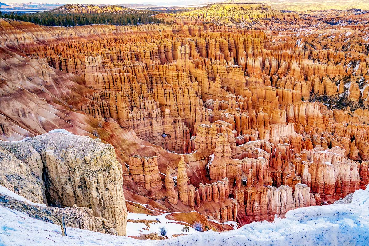 位於南猶他州的布萊斯峽谷,於1928年列為國家公園,以其瑰麗的色彩和獨具一格的地形而聞名。站在峽谷的邊緣望著上萬個由風霜、雨雪歷經千萬年侵蝕而成的石柱,有的像中國秦朝的兵馬俑,有的又像童話中的城堡、有仙女、有棋盤…更精采的是,隨著陽光的移動而瞬息萬變的色彩,橙色、棕色、紅色、灰色…深深淺淺的千變萬化,讓人驚嘆造物者的神奇。我們將分別由日落點及日出點眺望峽谷,視野之遼闊,彷彿可以遠眺歲月的盡頭。