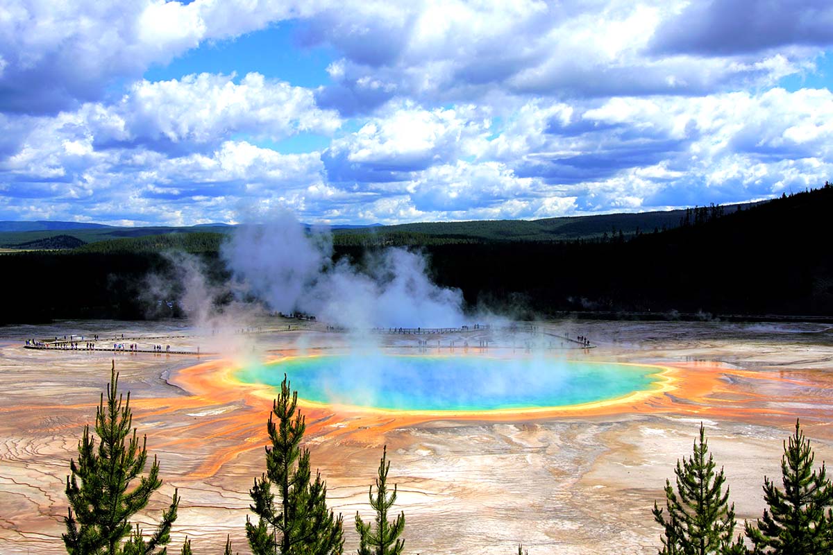 它是黃石公園面積最大的溫泉池,色彩繽紛豔麗,有如彩虹般的紅、澄、黃、綠、藍、靛、紫等七彩色,沿著池畔的木板步道,可以一覽大稜鏡溫泉的奧妙。
