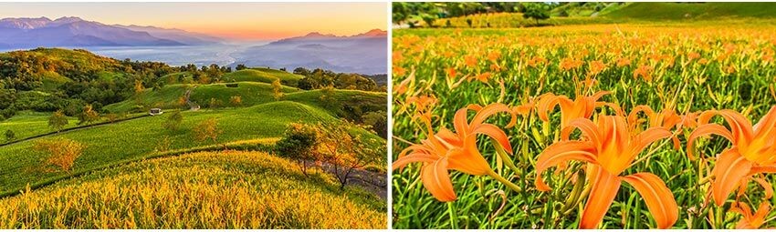 六十石山、赤科山、太麻里山為花東縱谷三大金針栽植區,也是每年8月至9月賞金針花海的好去處。六十石山位在富里鄉竹田村東側海拔約800公尺的海岸山脈上,經過一段蜿蜒的山路後,眼前出現無邊無際的田野景致,幾座農舍、涼亭散落在金黃色的金針花田間,形成一幅樸質的田園畫作。
